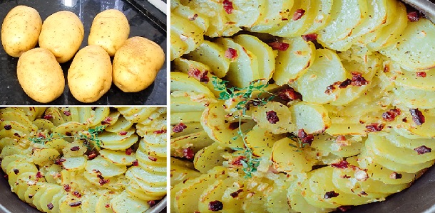 Picamos el tocino y lo esparcimos cobre las papas. Sazonamos con sal y pimienta al gusto. Vaciamos entonces la mezcla de mantequilla y cebolla sobre las papas en el molde de tal manera que estén bien recubiertas. Esparcimos finalmente el tomillo seco y ponemos en horno caliente a 200ºC por unos 25 minutos.