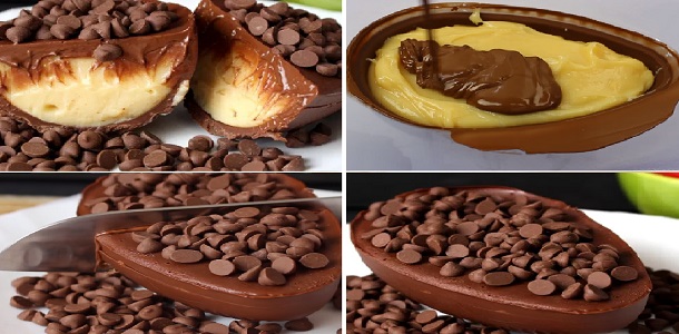 Distribuir el chocolate templado en una forma de huevo de pascua que se separa por el fondo y los laterales.