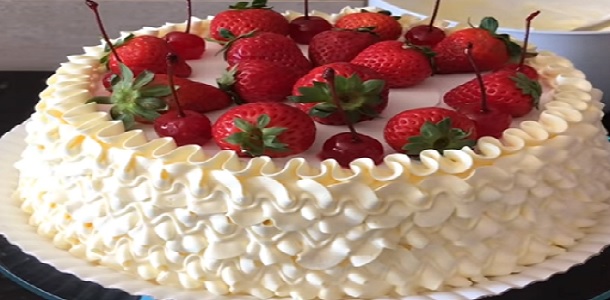 15. Corte alguns morangos ao meio e reserve. Cubra o bolo com o chantili e decore com os morangos reservados.